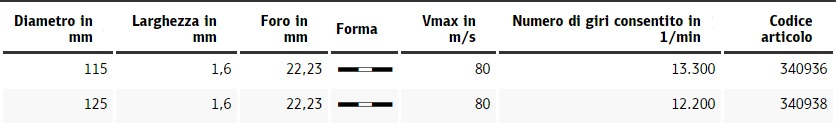 Vantaggi: Nessuna presenza di ferro, zolfo e cloro - Impiego universale su acciaio e acciaio inossidabile (INOX) - Disco da taglio in corindone cubico calcinato, autoaffilante - Ridotta formazione di bava, durata elevata - Particolarmente indicato per il taglio di materiali sottili, come profili e tubi